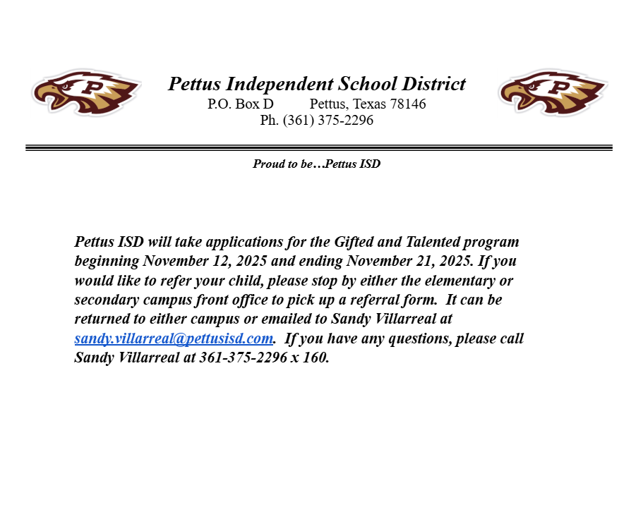 Pettus ISD, in partnership with the community's commitment to quality education, is to provide an orderly learning environment, opportunities to gain knowledge and develop skills, attitudes, values, and personal esteem so that students become life long learners, thinkers and productive members of society.